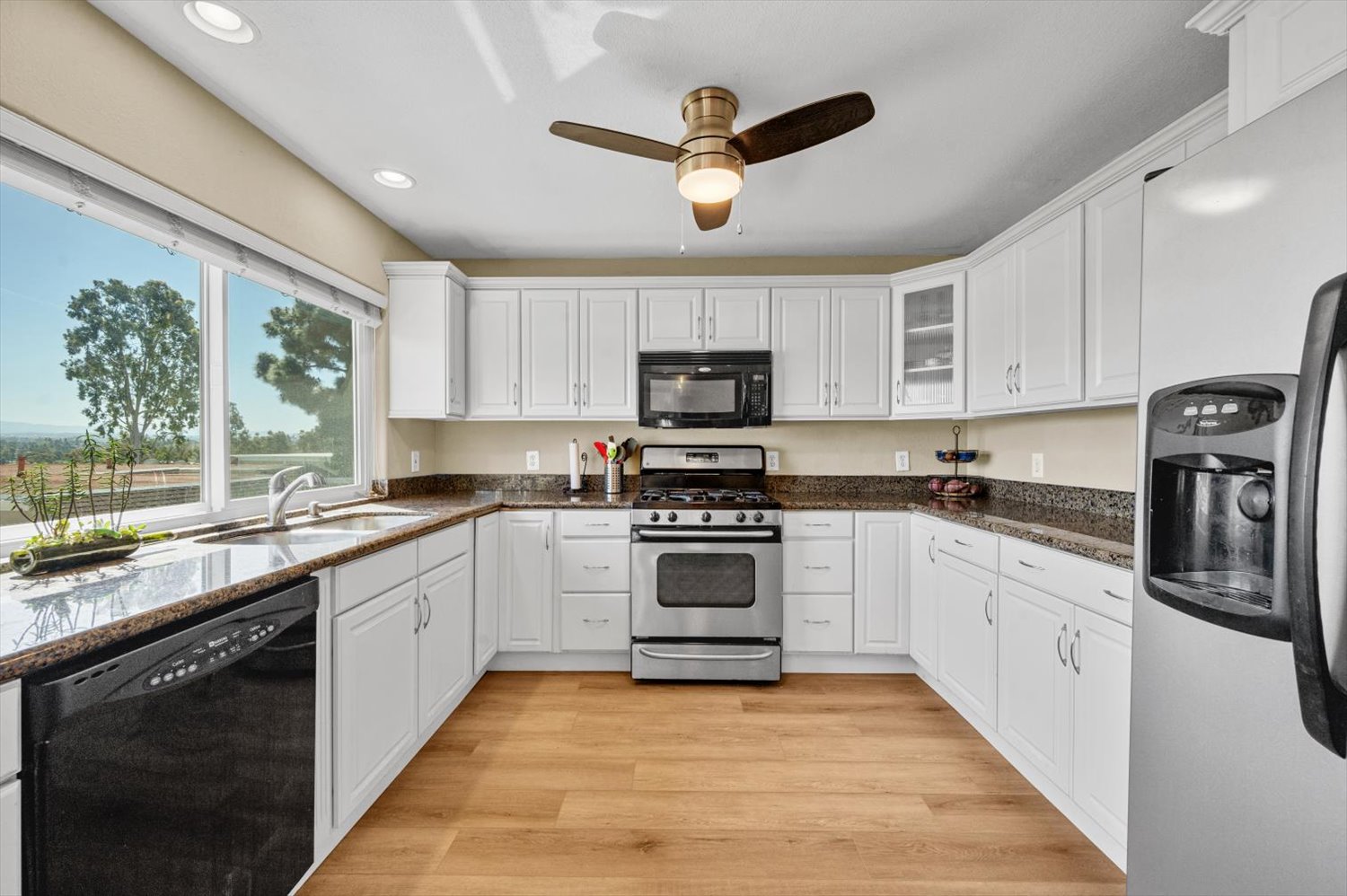 Inside, a formal entry leads to a bright living room with backyard access, a formal dining room with custom cabinetry, and a butler’s pantry that connects to a chef’s kitchen. The kitchen features granite countertops, a large island with a new gas cooktop, new double ovens, new dishwasher, built-in refrigerator, microwave, warming drawer, trash compactor, and a sunny breakfast nook. The kitchen opens to a spacious family room with a stone fireplace, built-in entertainment center, and whole-home surround sound. The main level also includes a custom office/library with rich built-ins and plantation shutters—ideal for working from home, plus a private bedroom with full bath, and laundry room with sink and cabinetry.